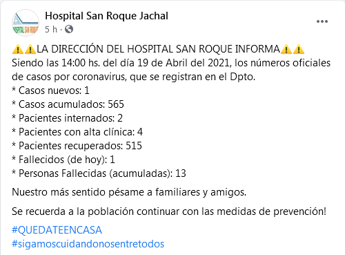 Siendo las 14:00 hs. del día 19 de Abril del 2021, los números oficiales de casos por coronavirus, que se registran en el Dpto.