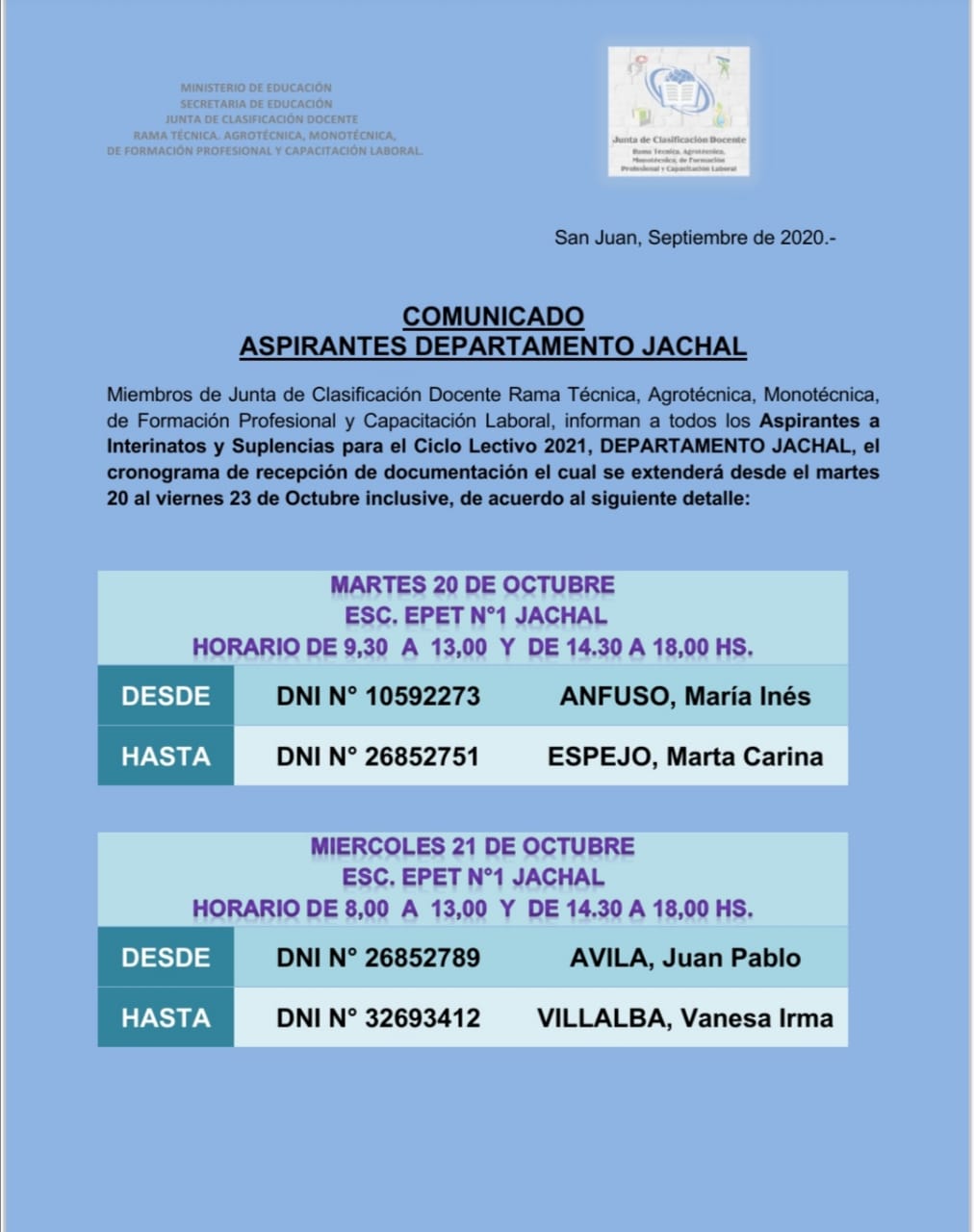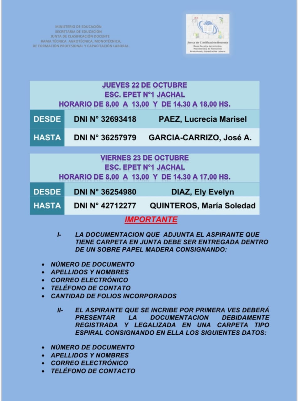 La junta de rama técnica informa a aspirantes del departamento Jáchal que: Miembros de la junta de clasificación docente rama técnica, Agrotécnica, Monotécnica, de formación profesional y capacitación laboral, que todos los aspirantes a interinatos y suplencias para el ciclo lectivo 2021, DEPARTAMENTO JÁCHAL, el cronograma de recepción de documentación el cual se extenderá desde el martes 20 al viernes 23 de Octubre inclusive, de acuerdo al siguiente detalle