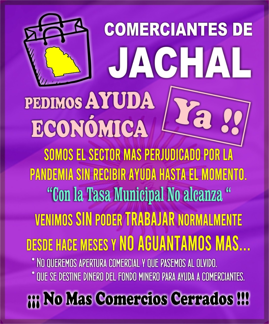 En el día de hoy, un grupo de comerciantes respaldados por la cámara de comercio jachallera, hacen llegar un petitorio a la municipalidad de Jáchal, solicitando al ejecutivo municipal y al Honorable Concejo Deliberante una ayuda económica retroactiva al mes de Agosto y que los montos se vayan incrementado hasta el mes de Diciembre 2020, además de la eximición de impuestos municipales por el lapso de tres (3) años.