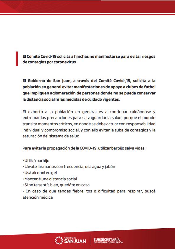 El Gobierno de San Juan, a través del Comité Covid-,19, solicita a la población en general evitar manifestaciones de apoyo a clubes de futbol que impliquen aglomeración de personas donde no se pueda conservar la distancia social ni las medidas de cuidado vigentes. El exhorto a la población en general es a continuar cuidándose y extremar las precauciones para salvaguardar la salud, porque el mundo transita momentos críticos, en donde se debe actuar con responsabilidad individual y compromiso social, y con ello evitar la suba de contagios y la saturación del sistema de salud.