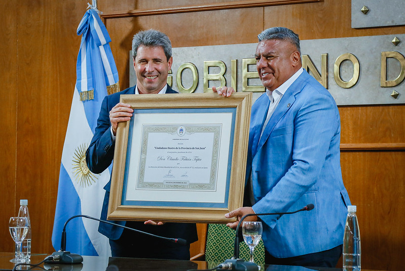 Durante el acto, Uñac entregó a Tapia la Declaración de Ciudadano Ilustre y también se lo distinguió con una medalla, como persona destacada que visitó la Casa de Gobierno.